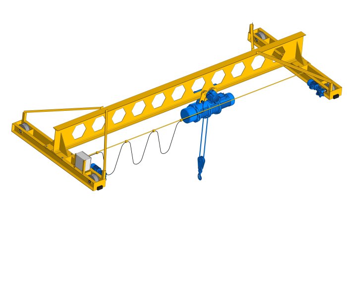 Пролетная балка перемещается по крановым путям при помощи концевых тележек с одним приводным или двумя приводами на каждой концевой балке. В качестве опоры для путей возможно использование независимой конструкции или жестко связанных с несущими стенами здания силовых элементов. Для перемещения каретки тельфера по балке предусмотрены собственные колеса и электромеханический привод. Подъем груза осуществляет электрическая тросовая (цепная) таль. Оператор (машинист) управляет техникой с пульта или из кабины.