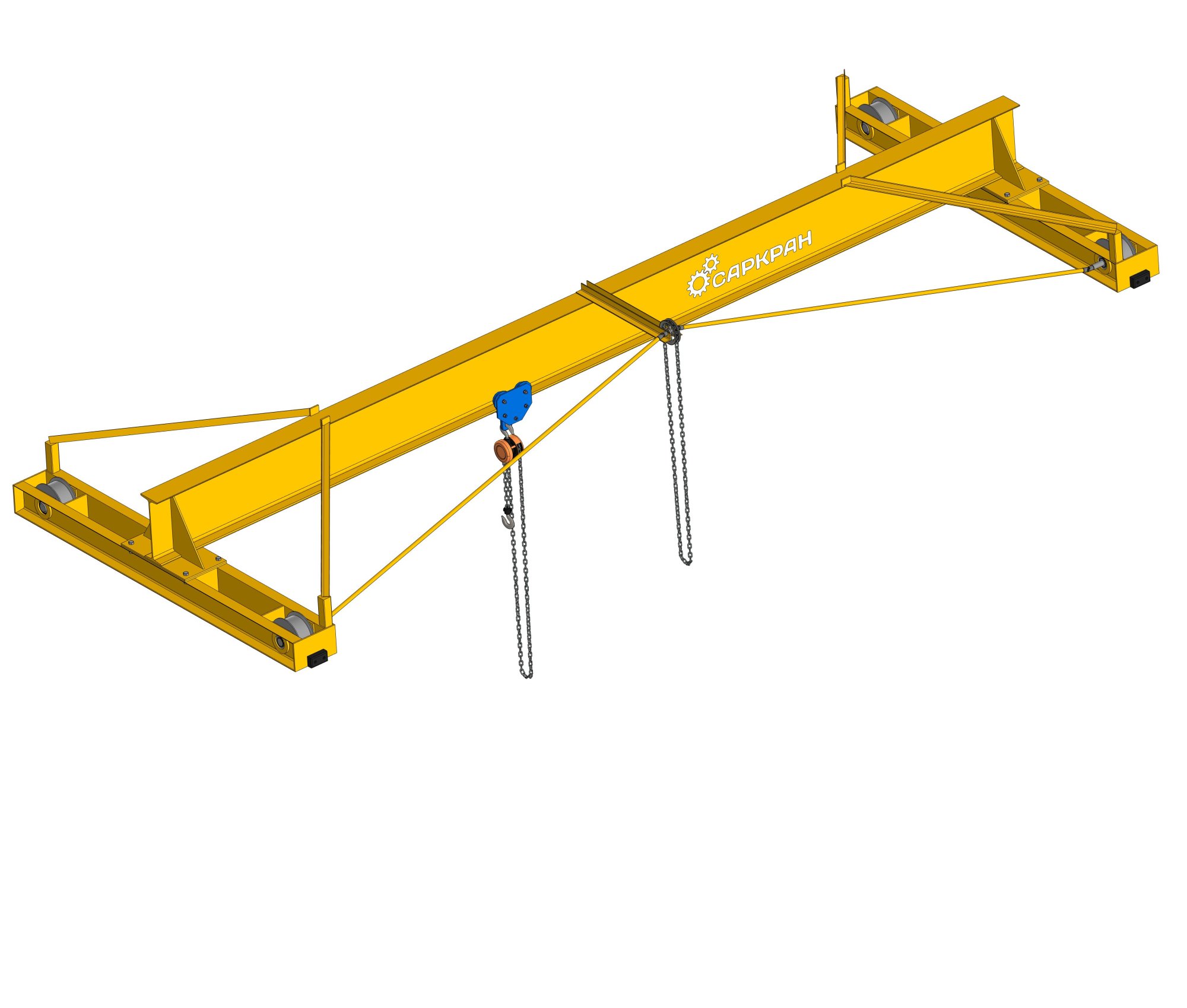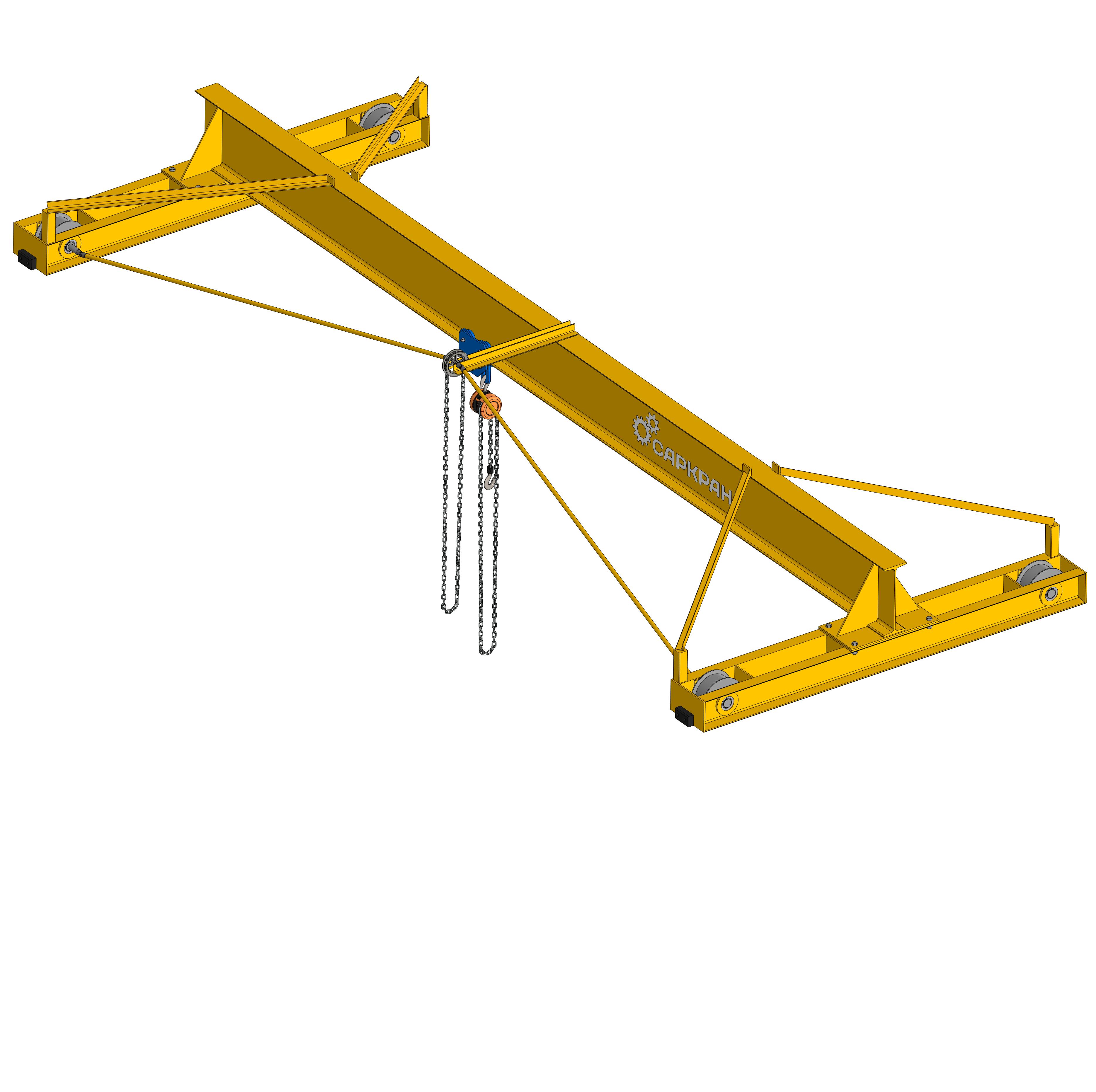 Основной частью конструкции опорной однобалочной ручной кран-балки является пролетное строение мостового типа, с применением сварной балки, а также трубного или двутаврового сечения. Она опирается на две концевые тележки, движущиеся по крановым рельсам или полнотелому квадрату, расположенным на подкрановых балках. Тележки оборудованы одним приводным и одним опорным стабилизирующим колесом. По пролетному строению перемещается ручная таль. Движение пролетного строения кран-балки и тали с грузом осуществляется за счет передачи мускульного усилия оператора через ручной привод на тележки и грузоподъемный механизм. По прочностным характеристикам основной пролет ручной кран-балки соответствует требованиям категории А3. Для прокладки крановых путей необходимо построить стационарное основание или использовать надежно прикрепленные к несущим конструкциям здания опоры.